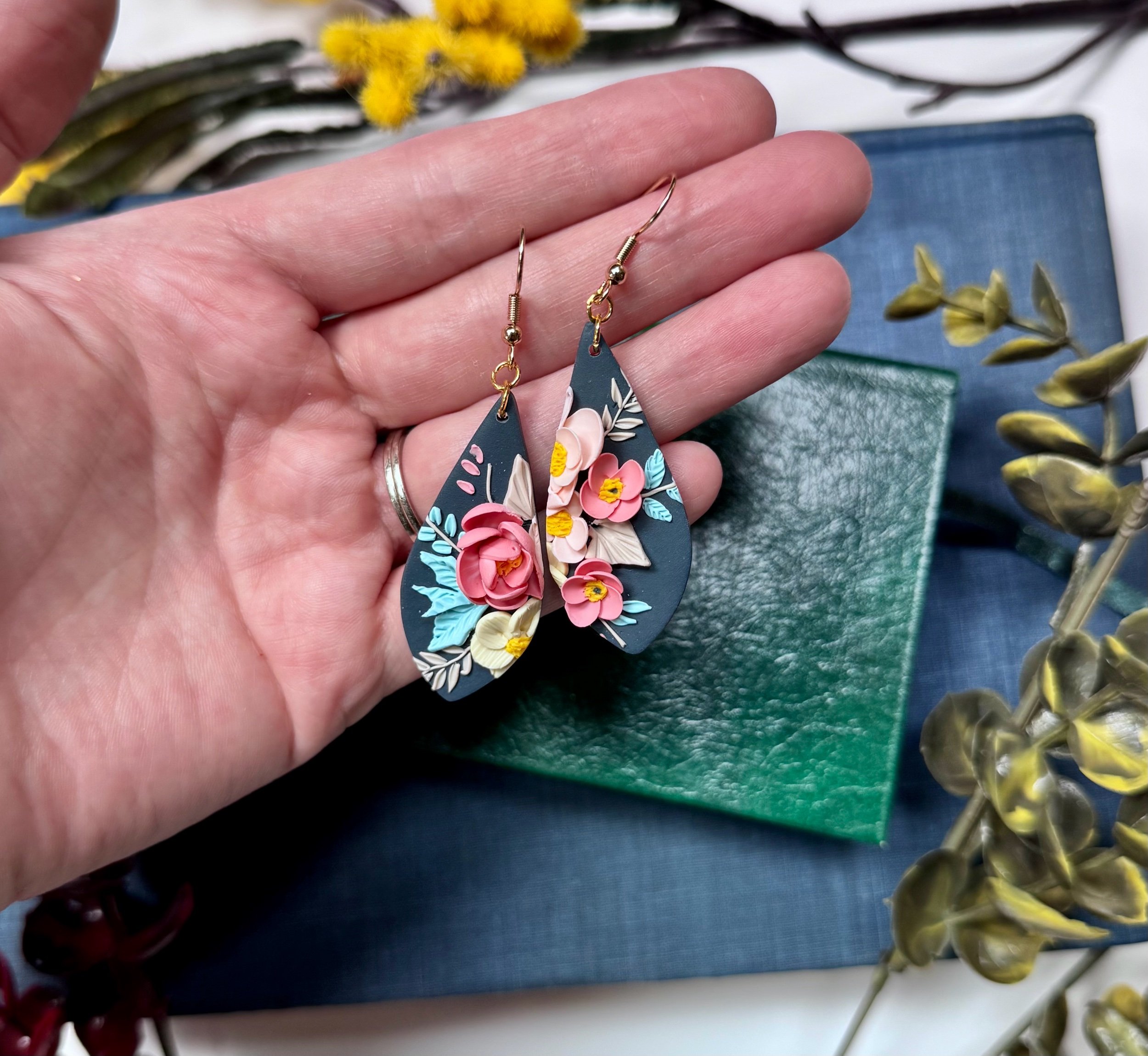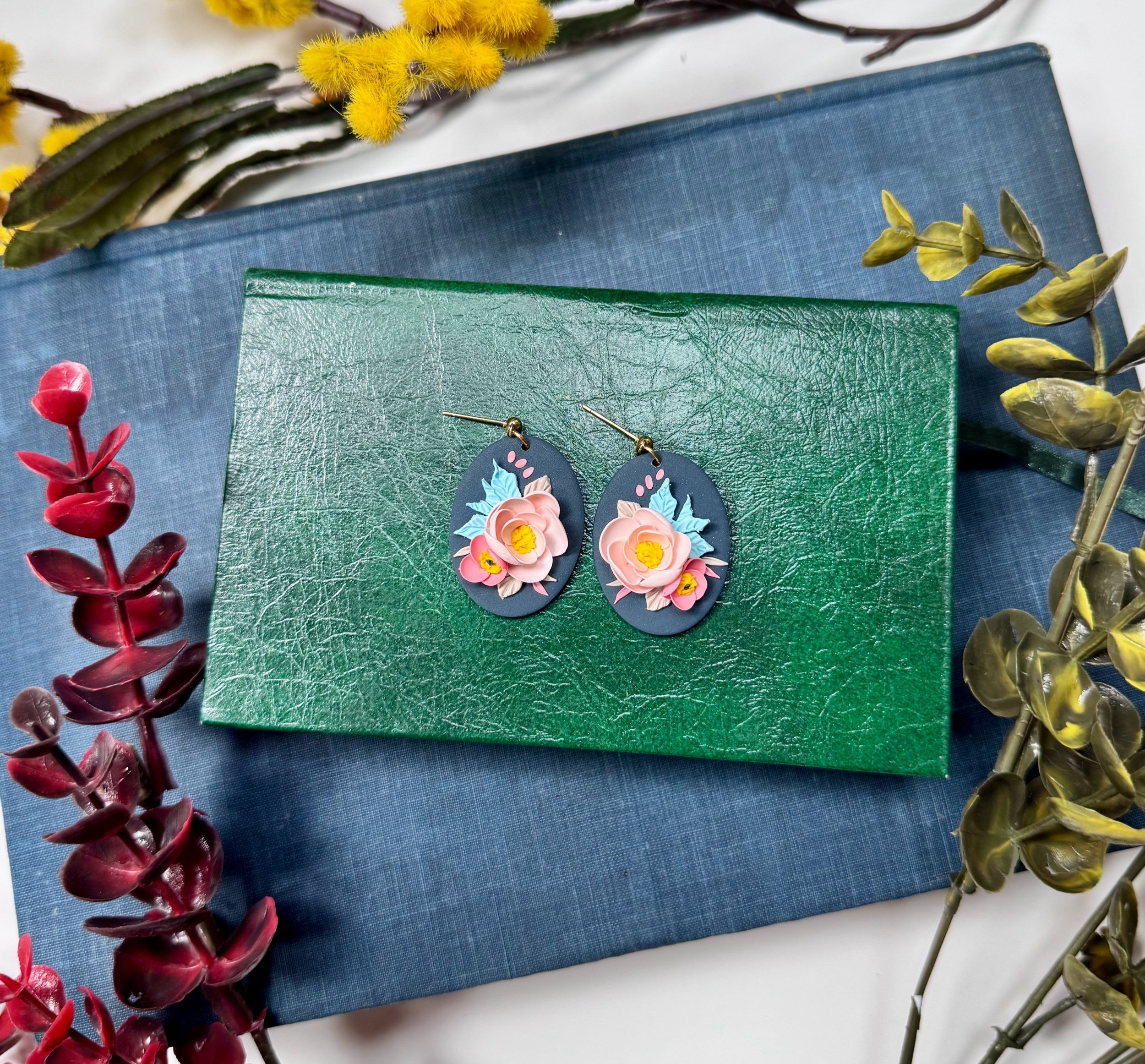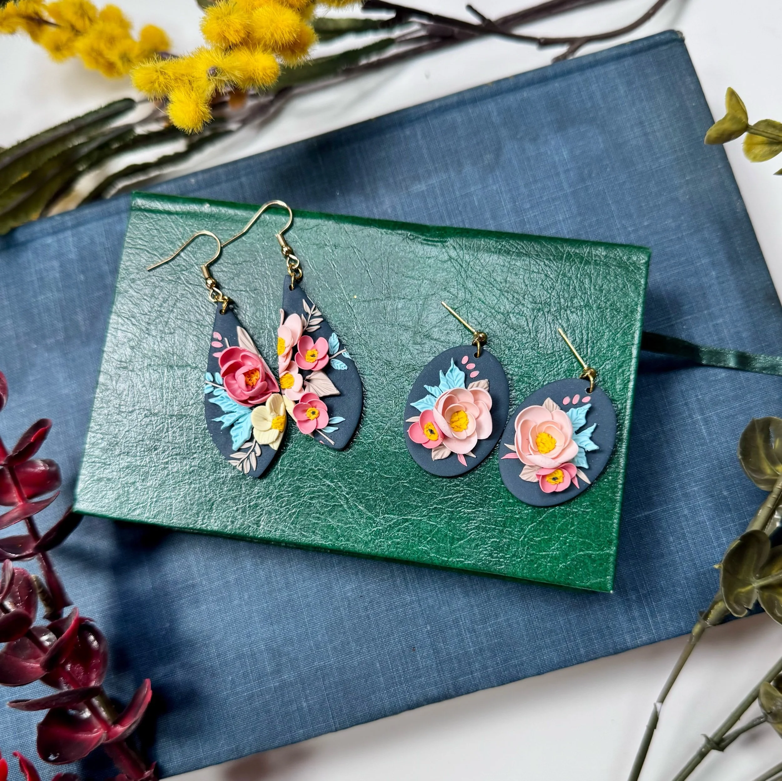 Pink and ivory hand-formed floral earrings on a light gray background, made out of polymer clay.